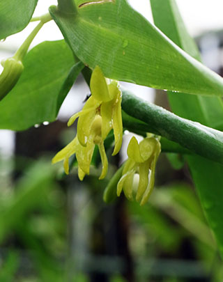 現在希少とされるデンドロビウム2種が開花中です。左はDen. cymboglossumのflavaフォームです。一般フォームはセパルに複数のラインが入ります。一般種として入荷した株の中に偶然1株本種が混在していました。右はDen. vexillarious v. retroflexumでセパルおよびペタルは白色に近く、セパル・ペタルの背面が薄っすらと青味がかっています。これらは昨年に続き2回目の開花となります。前者は高温室、後者はクール室での栽培で、いずれも現在は炭化コルク付けですが、Den. vellillariousは、前に本ページで取り上げた山野草鉢へ、花後に植え替えを予定しています。