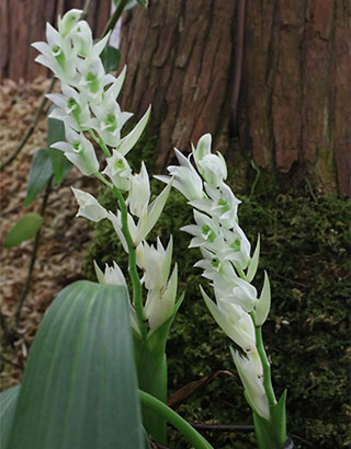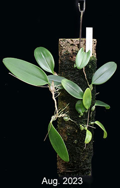 その右は炭化コルクに植付けてから3年半後の2021年4月に得た初花で、株は左の入荷時の画像に比べ生気があるものの、葉数は4葉程で植付け時から株サイズに変化はありません。画像4はその初花からさらに2年後の株で、株サイズは入荷時と比べ倍近く増えています。すなわち画像2の入荷状態から画像4に示す株サイズになるまでには6年近くが経過したことになります。