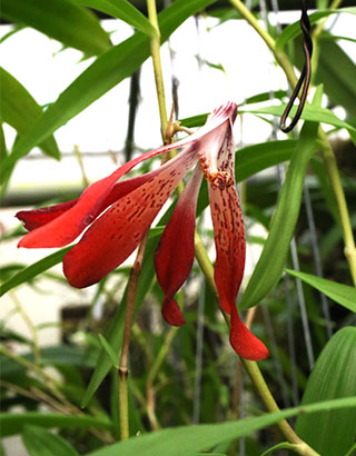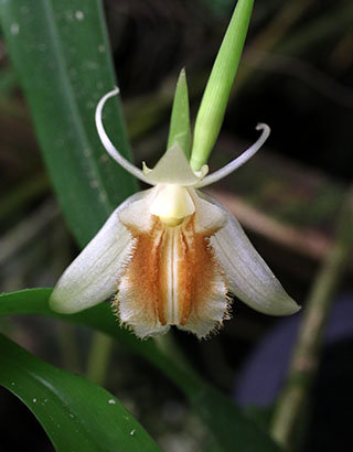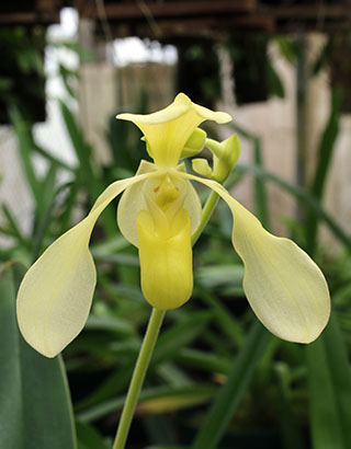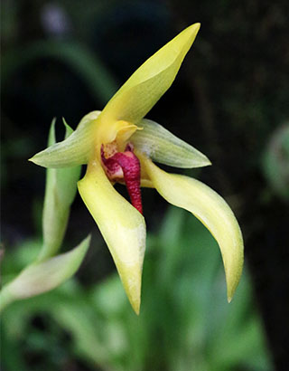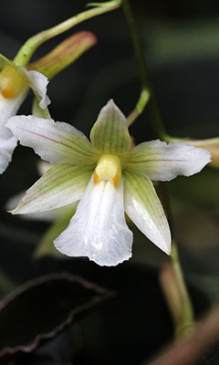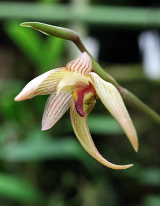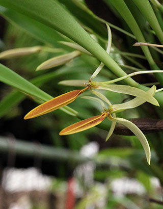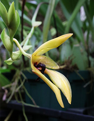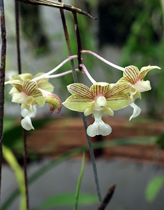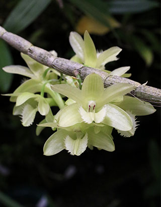 現在開花中のDendrobium serratilabium flava、Dendrobium stuposum redおよびCoelogyne bicamerataを撮影しました。フィリピン生息種のDen. serratilabiumはノコギリ状のリップ外縁形状が特徴で、その種名の由来ともなっています。当サイトでの本種の初入荷は2009年ですが、現在栽培している株は全て2019年にレイテ島生息種として入手したものです。このロットは、開花時のセパル・ペタル全体が薄黄緑単色で一般種とは大きく異なっており、また栽培を通して得た生態からはやや中温寄りで、標高が800m以上の生息種ではと推測しています。とりわけ下画像の株は緑味のあるベース色の花にしばしば見られる、セパル・ペタルの背面に残る薄い赤褐色のラインやSpur(距)に滲みは一切無く、ネット上からは他にこうしたフォームが見当たらないことと、このフォームは例年継承されていることから極めて稀な株と思われ、当サイトではflavaの付帯名をつけています。