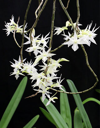 現在、Den. jiewhoei の開花期を迎えています。本種は近年発表(J.J.wood, etal. 2008)のデンドロビウムで、ボルネオ島標高1,000 - 1,500m程の生息種とされます。また2014年にはDen. calcariferum(Carr. 1935)とはシノニム(異名同種)とされ、IOSPEのDen. calcariferumとDen. jiewhoeiのサイトページには同じ花写真がコピーされています。不思議なことは、両種の生息域が重なっていることと、近年の情報化時代に於いて、なぜDen. calcariferumの発表から凡そ70年後にMalesian Orchid Journal Vol.3, 2009年に本種が新種名で掲載されたのか、現在、Den. calcariferumを検索するとDen. jiewhoeiと思われる多数の画像がネットに見られますが、そうした画像は2009年までそれぞれのメディアに掲載されることが無かったのか?よく分かりません。