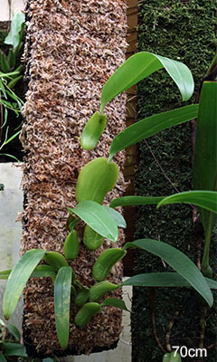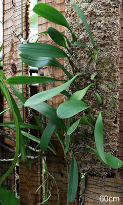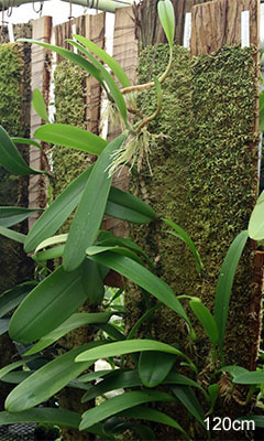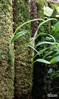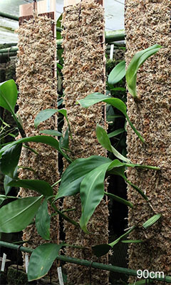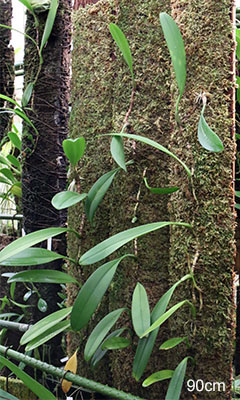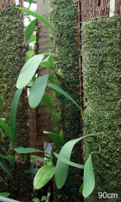 前項の16種の植替えに続いて、今回は90㎝長の杉板(1㎝厚x15㎝幅x90㎝長の杉板に杉皮を重ねた構造)に新たに植替えた3種を撮影しました。いずれも取付面積の1/2 - 1/3近くを株の伸びしろとしており、植付け直後の下画像からはずいぶん空いた面積が広いように感じますが、株が60㎝程になると成長も早く2-3年でリードバルブの葉先はこの取付材の長さを越えるほどになると思われます。下画像のそれぞれのバルボフィラムは、ネットの検索からは、いずれもマーケット情報が少なく、現在入手が難しい種のようです。