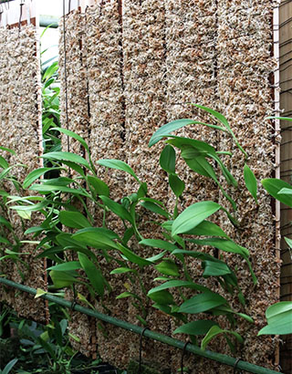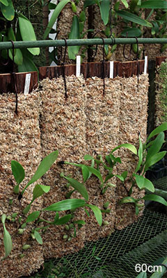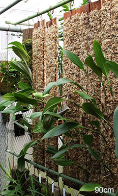 連日の植替え作業が続いています。バルボフィラムの植付けは昨年8月頃までは炭化コルクにヤシ繊維マットを重ねミズゴケで根を覆う方法でしたが、その後は株サイズにかかわらず、10種程を除き全て杉板への植付けに替わっています。一方、茎が下垂あるいは半下垂性のデンドロビウムも一部は杉板へ植付けを行っているものの、現在は殆どが木製(チーク)バスケットとなっています。そのため、これまでの1年間は炭化コルクへの植付けは1株もありません。下画像は最近植替えのバルボフィラム16種です。それぞれの株画像右下のcm表示は取付材の長さです。幅は全て15㎝に統一しています。この中で70㎝長の取付材はヘゴ板で他はすべて杉板です。花画像の詳細はそれぞれの花画像上の青色種目のクリックで見られます。