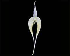 下画像のバルボフィラム3種が栽培されている高温室内では、晴天日の日中の温度は35℃以上、一方デンドロビウム2種の中温室内では30℃前後となる中でのそれぞれの開花となっています。Den. klabatenseは42輪の同時開花で下画像は3日の撮影です。株の根元に小さな新芽が出ていたため今回は高温障害を恐れ、撮影後に全ての花を摘みました。高温室栽培のPaph. lowii var. albumは、20年近く前に米国Orchid Innから入手した実生(自家交配)株で、花サイズは左右のペタル間スパンで9-10㎝となります。