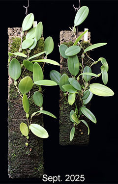 入荷から画像8に至るまでに凡そ8年が経過しました。これらの栽培の経緯から分かることは、2017年10月の入荷での株状態から初花を得るまでに3年以上の歳月を要した一方で、2023年8月から2025年9月に至る僅か2年間には2倍を越える株サイズに急成長し、リードバルブが支持材を越える程の勢いとなっていることです。全ての種が同様とは云えませんが、入手した株が僅かな葉付きバブル数で、さらにサプライヤーの出荷準備による根の損傷が見られる場合では、そこから大株にするには長い年月が避けられないこと、しかしその種に適応した環境に順化した株(海外ではこうした株をEstablished plantと云う)は急速な成長が見込まれることが分かります。時として前記したように、その種が入手難な場合には、止む無く3バルブ程の小さな株を入手せざるを得ないことも多々あります。この場合は葉だけでなく根の点検が重要で、複数の根がしっかりと張っていることを確認することがその後の成長の需要な前提となります。根に水を吹きかけても根皮が灰色や黒くて硬さを失い柔らかくなっている状態は、いくら根があっても株の成長には寄与しません。