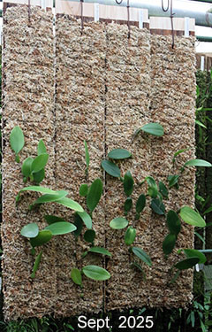 下画像左は2023年8月に上画像4の株(右側)と別の1株(左側)を新たに炭化コルクとヤシ繊維マット構成の2枚の支持材にそれぞれ植替えた時の撮影です。右の4輪の花姿は、画像5の植替えから1年半後の2025年1月の開花です。また画像7は今年9月に画像5のその後を撮影した株姿で、この2株をそれぞれ2分割し4枚の90㎝杉板に植替えたのが右画像で現在の姿となります。この広い伸びしろのある支持材であっても今後2年程で覆われると思います。
