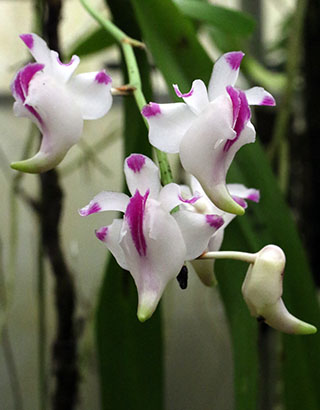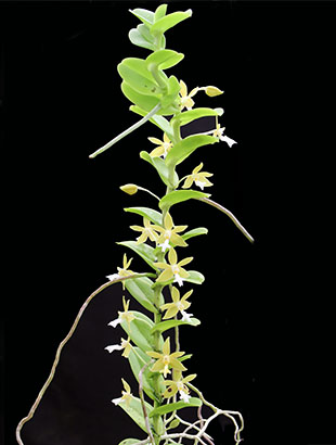 本種はマレー半島、タイ、スマトラ島、ボルネオ島などの低地に分布し、下画像左に見られる個性あるリップ形状を持つデンドロビウムです。花サイズは2.5㎝程です。当サイトが本種を入手したのは2016年頃で初花は2017年5月でした。特徴は1本の元茎(疑似バルブ)から一般的に言われる高芽ではなく複数の幹枝を出し、それぞれの枝の節から発生する根を支持体に活着させながら上方に伸長していきます。現在、国内外共にネットにはマーケット情報が無いことから入手難と思い、5年ぶりに本種の植替えを行いました。画像右は長さ90㎝x幅15㎝の杉板で、すでに頂芽は支持材の上端に迫っており1年で越えると思います。多輪花の同時開花を期待しているところです。