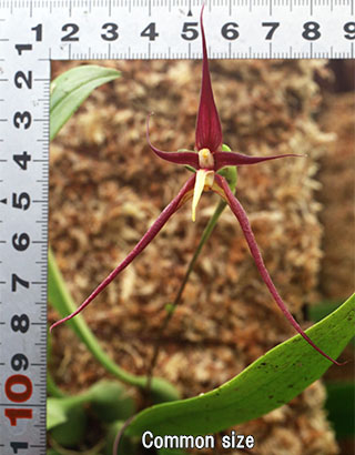 ところでマーケットにおいて、上画像に見られる花株を期待してBulb. dolichoblepharon名で発注する場合、販売業者や趣味家を含めて花を確認した株を入手することが必須です。上記のような現状を考えると花の確認(花写真を含め)のない株の殆どはシノニムとされるBulb. brevibrachiatumとなる可能性が高く、そうであってもシノニムとされる以上、発注名の種に間違いは無いとされサプライヤーにクレームは出せませんので注意が必要です。これはBulb. brevibrachiatumの入手も同様で、この名前で上画像中央の花株を期待しても、OrchidRootsサイトが示すように、多様な花形状がBulb. brevibrachiatumとして公表されている限り、そうした中のどの花株が入荷するかは分かりません。