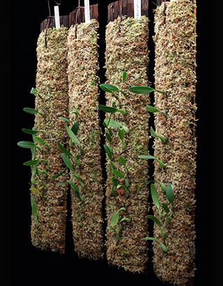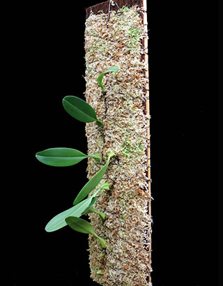 下段中央が示す支持材では凡そ上半分が伸びしろ空間となっていますが、3年程で全て新葉に覆われると思います。現在のバルボフィラムの植付けでは、根を含め40cm以下の株サイズは60cm以下の杉の無垢材に、これを超えるサイズでは支持材の重量が増すため、杉板と杉皮を重ねた構成の支持材としています。