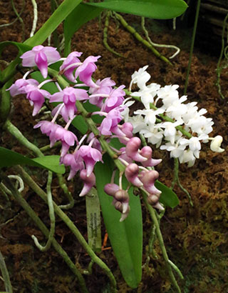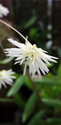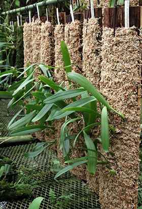 Bulb. dolichoblepharonとBulb. othonisの植替えを先週行いました。両種はリードバルブや脇芽が垂直方向と共に横方向にも盛んに伸長する性質があり、今回は支持材をリードバルブがはみ出す状態となっていたため植替えとなりました。横方向の伸長に対応するには幅広の支持材が必要ですが、吊り下げ型ではスペースを取るため難点となります。当サイトでは吊り下げ支持材の横幅は15㎝以下としており、これを越える場合は超えた部分を植替え時に株分けし、切り取られた株は位置を変え改めて同じ株に寄せ植えし、縦長の株姿にすることにしています。下画像左のBulb. dolichoblepharonは前項でも取り上げました。一方、Bulb. othonisはBulb. nutansとしても知られていますが、当サイトでの本種の花はネット検索で多く見られる薄黄色ではなく鮮やかな白色フォームで多輪花で開花すると良く目立つことから、これらの植替えのタイミングを待っていたところで、ようやく出来ました。支持材は共に杉板60㎝長x15㎝幅です。