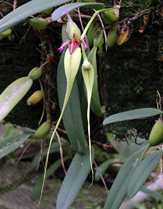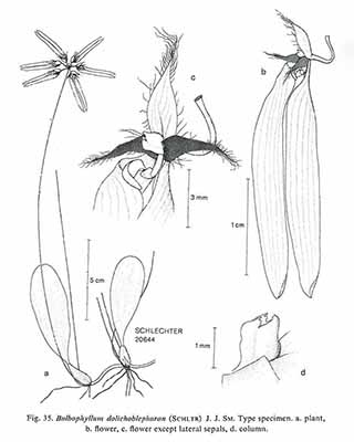 Bulb. dolichoblepharonはBulb. brevibrachiatumと共に、R. Schlechterにより1912年に発表されたバルボフィラムです。しかし、いつの時点かは不明ですが両種は現在、シノニム(異名同種)とされています。そうした背景からIOSPEでは、Bulb. dolichoblepharon名の検索ではBulb. brevibrachiatumにリンクされ、またOrchidRootsも同様に本種名のページには花画像が無く、シノニムとしてBulb. brevibrachiatumへのリンクアドレスが表記されています。