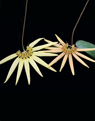 下画像は当サイトが栽培している上記3種の花写真です。この画像からは明らかにBulb. dolichoblepharonの姿は他の2種と比べ、個体差の範囲を超えた様態であることが分かります。これらの画像や前記の多数のサイトでの現状からは、なぜ本種がBulb. brevibrachiatumと同一種として恒常化されるに至ったのか不思議です。当サイトが栽培するBulb. dolichoblepharonはフィリピン・ミンダナオ島生息種として2016年に本種名で入手したもので、2017年の東京ドームらん展では共同出店したフィリピン蘭園の一般客用プレオーダーリストにも本種名がありました。視点を変えて、Bulb. dolichoblepharonとBulb. brevibrachiatumが同一種であるとすれば、こうした混乱の背景には両種が1911年の命名時点には同じSulawesi島生息種でもあり、当初の同定サンプルからは異種と思われたものの、島内には両種の中間体が生息した可能性もあり、後になって同一種ではと見做されたのではとの推測もされます。その一方で、下画像のBulb. dolichoblepharonとBulb. brevibrachiatumは共にフィリピン生息種ではあるものの、こちらは生息域が分離(前種はLaguna州、Panay島、ミンダナオ島に対し、後種はNueva Vizcaya, Mindoro島)されていることから、そうした中間体の存在が無く、J. Cootes著に見られるように両種の形状の違いが明確であったことから別種として分類できたのではとも考えられます。