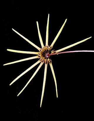 いずれにしてもフィリピンBulb. dolichoblepharonの花株は下画像が示すように他種とは明らかな違いがあり、また国内外共にネット上には現在、当サイトが栽培する花形状のBulb. dolichoblepharoが見られないことと、Cirrhopetalum節の中では最も華麗な花姿をもつ種の一つでもあることを考え合わせると、画像種は未登録の新種の可能性もあり、種名問題は今後の課題となります。
