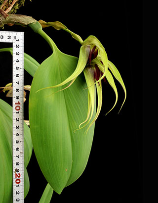 Bulb. magnumは2014年に入手して以来、すでに12年となり現在30株程を栽培しています。当初は栽培方法が不明で温度や植付けに試行錯誤をしましたが、近年では花茎当たりの開花数はその殆どが3輪で花サイズもラテラルセパル長は11cmを超えています。ここ数年で本種の栽培方法はほぼ確立したと考えています。下画像は昨年4月に90cm長の杉板に植え付けた株です。葉長は葉柄を含め22cm程ですが葉幅は広く、ラテラルセパルと同じ11cmです。| Bulbophyllum magnum PHL | ||