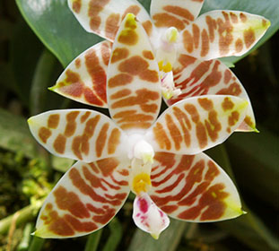 3.形状 3-1 花 ![]() 1.花被片 花名はアンボン島産という意味。花の直径は4.5-5cm。それぞれの被花弁は丸味のある楕円形(ノーマルタイプの花弁は長楕円)。野生種の大半(普通種)は下写真最上段に示す白色あるいはクリーム色をベースに茶褐色の太い棒状斑点が同心円状に入るフォームである。中心は白色。それぞれの花被片の先端部は薄緑あるいは薄黄緑色となる。花茎3-4本にそれぞれ3‐4個の花をほぼ同時に着ける。本種は胡蝶蘭原種の中で最も花フォームの多様な種の一つである。2段目の写真は花被片先端の黄色の割合がノーマルタイプに比べ増している。3段中央から5段のフォームはPhal. amboinensis v. yellowとされるフォームで花被片のベース色が黄色となる。これら yellowフォームは自然界ではめったいに見ることはできない。他種との交配で、この黄色はよく遺伝すると言われる。このため黄色の胡蝶蘭を作出するための品種として重要とされている。最下段左と中央はaureaフォームで右はアルバである。本種は強い香りを放つ。 しばしばPhal. amboinensis v. yellowあるいはflavaと呼ばれる変種のなかにベースが黄色、斑点が黄緑色の花柄がある。これに加え花弁が抱え咲き(前屈みに花弁が湾曲する)しているものはPhal. venosaとの交雑種とする見解がある。30年程前に最初に発見された野生の、ほぼ全体が薄黄色のflava タイプ(最下段左参照)からの継代種は現在入手が極めて難しい。またベースが茶色のbrown タイプと呼ばれるものは野生変種である確証がなく(誰が、いつ、何処で発見したか)、これもdark系Phal. venosaとの人工的な交雑種の可能性もある。開花時期は不定期だが、温室では年2回程の開化が見られ、早春と晩夏に多い。