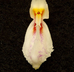 2. リップおよびカルス 下にリップ拡大写真を示す。リップ中央弁は白色をベースに中央部と先端部それぞれに、高く盛り上がった2つの竜骨突起があり、その側面を一本の赤褐色のストライプが走り、また突起頂上には鋸波状の凹凸がある。先端部は赤褐色の棒状斑点が左右面にほぼ2列に入る。蕊柱は通常青紫が混じった白色である。リップ中央弁の外形は長楕円形でエッジはなめらかな曲線である。一方、Phal. venosaは先端半分が細かい鋸状のエッジとなっている点で異なる。右端はリップの側弁を取り除いたカルスを示す。カルスは2組の、先端が2つに分岐した歯状突起がそれぞれあり、腺状突起はない。