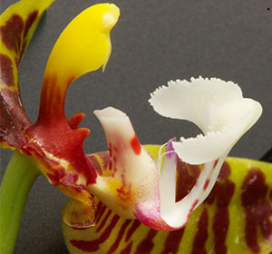 5.特記事項 Phal. pantherinaはPhal. giganteaと同じように林冠にも着生している。実生の入手は容易であるが、今日野生種を得ることは極めて難しい。本種は中央弁が長く伸び、先端の翼形状が特徴であるが、マーケットに中央弁の伸びが短いPhal. pantherina種名のタグがしばしば見られる。これらはPhal. cornu-cerviやPhal. lamelligeraとの交雑種の可能性がある。 | ||