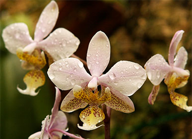 3-5 花茎 花茎は60cm長(野生株では1m以上も見られる)。2-3本の花茎を同時に発生し、それぞれの花茎はさらに2-3本に分岐し全体で20-30輪の花を付ける。温度が夜間18C、昼間25C程になると花茎を発生する。よって発生時期は12月頃から始まり、開花は早春となる。Phal. schillerianaと比べ1か月程遅い。花茎の寿命は一過性で花の終了とともに先端から枯れる。下写真は本種の野生栽培クラスター株の花茎発生様態を撮影したもので、この株の開花風景は本ページトップ写真(3-1項 花)の右写真である。