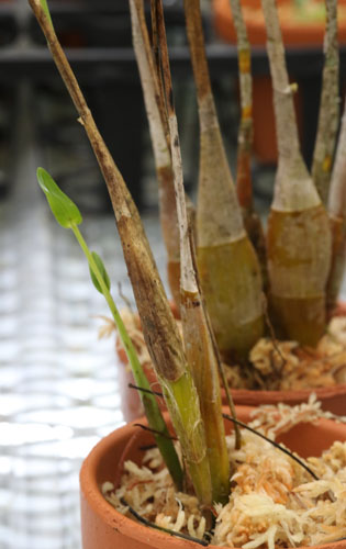 文句の言えないミスラベル 原種を販売する者にとって最も頭痛の種は、台湾やタイからの原種名を名乗る交雑実生株が頻繁に入荷することです。特に胡蝶蘭とVanda原種にその傾向がひどく、今や実生株のミスラベル(交雑種)は2/3を超え甚大な損害を被っています。防衛の手段は実生は買わないことですが、そうもいかない種もあります。昨年12月中旬にマレーシアを訪問し、sp(種名不明株)や国内市場にはこれまでほとんど見られないバルボフィラムを多数入手しました。その中でBulb. cuspidipetalumがあり、持ち帰ってそれまでのヘゴ板から杉皮板に移し替える際、おかしなことに気付きました。一つのヘゴ板には2株が取り付けられており、よって20株のBulb. cuspidipetalumの注文で10枚のヘゴ板となっているのですが、その2株は葉色は似ているもののリゾームやバルブが明らかに異なる株です。何やら胡散臭い感じを受けながらも、それぞれの株を10株づつ、2つに分けて植え替えを行いました。それが下写真で、左写真はBulb. cuspidipetalumの花、中央は今回の2つに分けた株、右がそれぞれの株を拡大したものです。左側がBulb. cuspidipetalumと思われ、右側は細いリゾームとバルブで葉も披針形で異なります。 またしてもサプライヤーごまかしの水増しかと思いました。変種があるとその写真を見せ、あたかもすべてがそれであるとして一般種を送り付けるいつもの手です。しかしインドネシアサプライヤーならばいつものことですが、これらの株はボルネオ島Sarawakからマレーシアサプライヤーによって入荷したものであり、こちらは意図的なごまかしはこれまでほとんどありません。そこでまだ相当数ラン園に残っていた記憶があったため、マレーシア園主に中央と右の写真を送り、調べるようにメールをしました。3日程経ち、細い方はやはりBulb. cuspidipetalumではないことが分かりました。それでは何かとなります。園主が調べたところBulb. signatumというのです。 はて聞いたことのない名前であり、ネットで調べたところ1996年の比較的新しく登録された種で国内市場での取引が見当たりません。花もなかなか個性があり、この組み合わせを怒ってよいのか、瓢箪から駒とみてよいのか迷うところです。Bulb. cuspidipetalumは10株減ってしまいましたが、珍種が10株増えたのであれば、こうしたミスラベルならまあ良しとしよう、といったところです。現在両者とも順化中です。