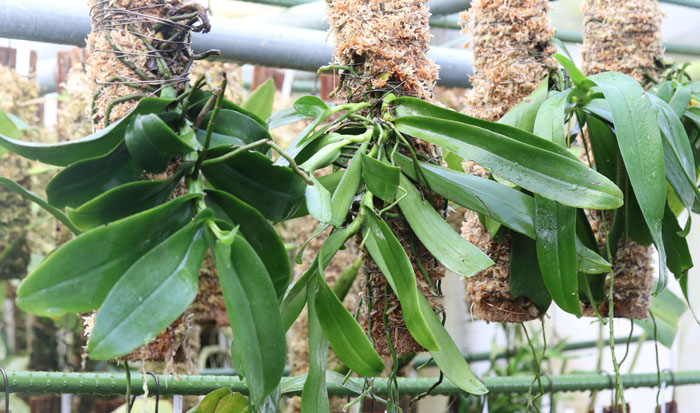 Coelogne sp 2種 昨年1月の歳月記に記載したスラウエシ島からのセロジネsp(下写真上段)と、Coel. monilirachisに似た色合いのリップに特徴のある低-中温タイプの、スマトラ島からのセロジネ(写真下段)が開花しています。前者はCoel. bicamerataと思われ、後者は4月に入手したCoel. aff. longifoliaeに似ているのですが、リップの中央から先端にかけてのやや円形の広がりと、現地で見た花色は薄黄緑であったことから異なる種なのか、いずれにしてもlongifoliae節であろうかと思います。ネットからは国内マーケットでの情報は見当たりません。現在はいずれも3,000円で販売しています。本種はフィリピン固有種で淡い紫色の花をそれぞれの葉元近くで同時に開花する種です。昨年9月の歳月記にて本種の巨大なクラスター株を紹介しました。引き合いが多かったため、昨年末のフィリピン訪問で再び1.5m長を超える15茎から40茎程のクラスター株を入手しました。またサンシャインラン展にて1mから1.5m長の本種3株を引き受けました。下写真がそれらです。自然界では大木の枝から真下に垂れ下がり生息いるものと思われます。 写真左の3株はバスケット植えにし、右の3株も近々バスケット植えを予定しています。左写真で左の大株が10,000円、中央が6,000円、右が8,000円、また右写真は株の長さは左写真とほぼ同じ1mから1.5m長あり、それぞれが10茎1株からなり4,000円です。一つの栽培は、例えば右の3株は元を言えば1株であったものを分割したものと思われるため、3株を寄せ植えして大きな株にして1-2年後に開花株を展示会用として出品すればかなり迫力があるように思います。