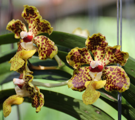 Vanda lombokensis Vanda lombokensisが、入手してから2年5ヵ月を経て初開花しました。最初のロットは10株程でインドネシアLompong地域生息とされる品種で現地では仮名のVanda lompongenseで呼ばれていたため、本サイトでもその名前で2015年4月の歳月記に掲載しました。同じころインドネシアのコレクターがWebsiteかFacebookで同種と思われるVandaを取り上げていた記憶があります。当初は現地価格がかなり高価で本サイトでは35,000円とし販売しました。その翌年からインドネシアLombok島生息種とされる同種と思われるVanda lombokensisが市場に出るようになり現地価格も低下したため1年半後の第2ロット以降は本サイトにおいてもFSサイズ(35-40㎝高)を8,000円とし現在に至っています。はたして最初のLompongロットとその後のLombok島ロットが同じかどうかは不明ですが地域差と思われる若干のフォームの違いが見られます。Orchidspecies.comによれば1925年登録とされており、これだけ特徴のある古くから知られたVandaがこれまで市場に出ていなかったことは不思議で、同サイトに掲載の画像種も1925年の登録種かどうかは確定ができないと書かれています。下写真は左が2014年入手株で、右は今月開花した第2ロット株の花です。いずれも実物を本サイトが撮影したものです。リップのカラーフォームが異なり、これは地域差なのか個体差なのかは、本種の成長の緩やかさと、輝度不足が原因と思われる開花難であることから評価するにはサンプル数が少なく現時点では結論は出ていません。 本種の栽培法に関してはしばらくの間、共にLサイズのパークと軽石でプラスチック鉢に植え付けていました。しかしこの方法では植え込み材内部の高湿度下で根腐れが起こっており、例えばVanda sanderianaが育っている高湿度環境下であれば、小型の木製バスケットで茎を支えて根は空中に垂らす環境が良いことが分かりました。一方、乾燥気味の環境であっても前記コンポスト以上に気相を大きくする必要があります。1例としてコルクチップとLサイズバークの3:1程の割合のプラスチックスリット入り深鉢への植え付けが適当と思われます。