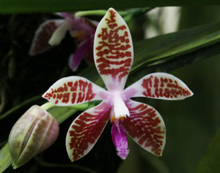 浜松温室の紹介です。 ジャングルの様相に近づきつつある本サイト温室の画像です。こちらをクリックしてください。原種の種類の多さでは屈指とマレーシアラン園主から言われています。最近はランの名前を覚える時間よりも新たに入荷する品種の方が多く且つ早く、名前の頭文字2-3字を記憶するのが精一杯です。それにしてもどこに何があるかはほとんどが分かると言うことはまだ頭の方は大丈夫かと妙な感心をしています。画像は4棟それぞれの、主に中央通路から撮影したもので温室の奥行きは15mです。各棟それぞれ左右の壁側にも通路(中央通路の裏側)があるため、この2倍近いランがあることになります。温室へのご訪問は予約となっています。温室内では販売のための見やすい配置をしていません。栽培優先の配置です。さらに最近は空いているスペースは余すことなく使わざるを得ない状況であるため、果たして何があるかを見て回るのに1日では到底無理で、興味のある種を予め決めておくことが必要となっています。温室で栽培する7割以上は野生栽培株で交配種(ハイブリッド)は一切ありません。(後記:トップページのメニューからアクセスできるように「本サイト温室風景」を加えました)Phalaenopsis corningiana 4月および5月はPhal. corningianaの開花期です。浜松温室では現在20株程が開花しています。本種は棒状斑点が花の中心から放射線状(それぞれのセパル・ペタル先端方向)に向かって棒状あるいは点状斑点が並ぶのが特徴で、同心円状に棒状斑点が入るPhal. sumatranaとは異なります。その斑点の密度は株により様々ですが、点からソリッドレッドまで変化に富みます。しかしPhal. speciosaとは異なり、開花毎に斑点の密度が大きく異なることはなく、ほぼ同じ様なフォームが再現されます。下写真は現在開花中のPhal. corningianaで、中段右と下段右の2株はそれぞれ10年ほど前に米国OrchidViewから入手したFernbrook AM/AOSで、他は全て野生栽培株です。昨年マレーシアにて野生栽培株の全面ソリッドレッドフォームを入手しましたが開花待ちです。これが開花すれば実生化を図る予定です。ソリッドレッドに近いフォーム、すなわちセパル・ペタルに赤味の占める割合が多いほど人気があるようです。一方で最近のネット画像を見てみると過ってのような濃い鮮赤色をもつ花がほとんど無くなり、くすんだ赤色が多いように思います。
