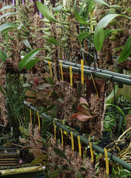 5月サンシャインラン展 1日から蘭友会ラン展がサンシャインシティにて開催されます。前日(31日)は据え付け作業となります。本サイトはVRT Japan名、隣はフィリピンからのPurificacion Orchidsでブース番号はそれぞれ33と34で会場の中央付近となります。本サイトでは胡蝶蘭、デンドロビウム、バルボフィラムが中心ですが、このラン展では一般的な品種の出品は少なくし、デンドロビウムとバルボフィラムは主に歳月記に掲載した新種やspを、一方胡蝶蘭は3-4種の改良種を除き30種以上で野生栽培株を出品します。おそらく胡蝶蘭原種の野生株が一堂に揃う出品は初めてではないでしょうか。実生とは異なる野生株の形状がよく分かると思います。多くの趣味家の来場を期待しています。サンシャインラン展でのBulbophyllum spの販売方法 2回のフィリピン訪問で、多数のバルボフィラムspを入手しました。3月初めの訪問ではミンダナオ島を中心にフィリピン南部の、4月末の訪問ではPalawanからのバルボフィラムでspだけで20種以上となります。問題は、これらは開花してみなければ種名が分かりません。幾つかはすでに開花しており、昨日はBulb. othonis (Cirrhopetalum nutans)の白と黄色(flavaフォーム)が開花し、また1週間ほど前にはBulb. flavescensらしき花が咲きました。未開花ですが生息地、葉およびバルブの形状からBulb. socordineと思われるバルボフィラムなども含まれる様です。浜松温室を訪問される多くの趣味家は、spでも株の形状からすでに所有しているものといないものを推測し購入されていきます。であればラン展でも、株の違いが比較できるように並べ、これを1株当たり2,500円から3,000円ほどで一堂に会し販売してはどうかと、後4日後のサンシャインラン展に出品をすることにしました。期待した種と違ったものになっても、この価格であればと言ったところでしょうか。下写真が現在在庫中のBulb. spの一部です。上段には6種類のバルボフィラムが吊り下がっており、写真の株はフィリピン南部生息種でいずれもバルブが太く葉長の長い大きな株です。下段は主にPalawanからで温室の別の場所に吊り下げた3例です。ラン展には20種程を各4株持って行く予定です。ラベルにはsp1から順次続き番号を付けましたが、それぞれが4株と僅かなので土日までには歯抜け状態になるかも知れません。 今回のラン展でのバルボフィラムについては国内マーケットでの取扱いの稀な種や、花は分っているものの種名が不明な種を中心に出品する予定です。 ボルネオ島からのDendrobium sp Den. bifariumに似たボルネオ島Sabah州生息とされるデンドロビウムの写真が4月にspとして送られてきました。Den. bifariumと生息地もボルネオ島と同じであることから、角度を変えて撮影すればこのような画像になるのではと、すでにDen. bifariumは在庫しているため期待しないで待っていました。しかしラン園の2代目が運んでくれた株を見て調べてみると葉形状がsp種は楕円で丸く、一方、Den. bifariumは披針形で明らかに異なり別種であることが分かりました。またDen. connatumも近縁種として知られていますが、こちらは葉先が割れている点はspと似ているのですが葉形状が方形で異なります。それではネットに似た種はないかとDistichophyllum節を中心に探したのですが今のところ見当たりません。マレーシア園主はこれまで取り扱いがなく新種ではないかというのですがそれ以上のことは分りません。胡蝶蘭と同じ高温室に置いています。下写真は上段左が今回の入荷株の花で、サプライヤーからの写真です。右が入手した株の葉です。一方、中段左は現在浜松にて開花中のDen. bifariumで右はその葉を示すものです。また下段は同じく浜松でDen. bifariumに混在し開花したDen. connatumと思われる画像です。こうした近縁種についてはリップ形状の分析からDen. connatumグループの変種や地域差とする研究もあるようです。