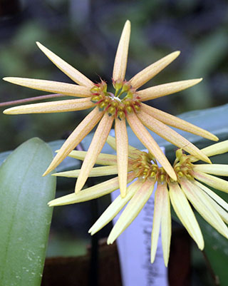Bulbophyllum othonis (Cirrhopetalum nutans) 4月フィリピンから持ち帰ったPalawan諸島からのバルボフィラムspの中からフィリピン固有種のCirr. nutansが開花しました。これまで本種はルソン島、PolilloおよびLeyte生息種とされていることからPalawanは最初の記録と思われます。葉表面は濃緑色で厚みがあり葉裏に赤みがあります。通常下右写真のようにそれぞれの花は方向が定まらず交差あるいは重なり合っているのですが、左画像の放射線状に整然と並んだ開花もあります。セパルの長さは2-5㎝と多様で、高温タイプです。