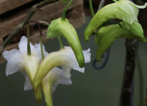 しかしSpurの僅かな形状の相違と、起伏の有無だけで別種とする分類法は、胡蝶蘭原種で言えばPhal. fuscataとPhal. kunstleriのカルス形状の微妙な違いで別種とされているようなもので、種名を付けて販売する側から見れば迷惑な話です。精々変種か亜種程度にしてもらいたいものです。1896年(Den. antherene)と1935年(Den. paathii)および1935年(Den. phillipsii)の時代では止むを得なかったと思いますが、新しい時代ではDNA分析による系統的分類法に期待したいところです。一方、これら非常に似た者同士の中でDen. phillipsiiが地質学的にボルネオ島と繋がっていたフィリピンPalawan諸島ではなく、なぜMindanao島に孤立しているのか、こちらの方も興味があります。 なお、本種は現在、中温環境で順化栽培をしており、植え付け1か月未満で新芽が現れてきました。かなり丈夫な種のようです。半下垂タイプのため植え付けはバスケットへの寄せ植えです。バスケット底に薄くミズゴケを敷き、根を少なめのミズゴケで巻いてから一株づつ適当な間隔で並べ(接触させない)、バスケットの針金を支柱代わりに株を固定し、コルクチップとバークおよびゼオライトをミックスしたコンポストで、バスケットや株と株との隙間を埋める植え込み方法としています。一つの中・大型バスケットに2-4株の寄せ植えを行っているため、全体をミズゴケで植え付けるのは濡れ過ぎとなり、一方バークミックスだけでは保水力不足となることを避けるための方法で、最近はほとんどのデンドロビウムのまとめ植えに、こうした植え込みを行っています。株のサイズに合った一つのバスケットに一株の植え込みであればミズゴケだけで十分と思います。 Dendrobium anthrene Green-form 上記で、Den. paathiiとして入手した株はDen. anthreneではないかとの説明をしましたが、そのなかから1株、蕾の段階から緑色(一般種は白と薄黄色)の強い株があり、これが開花しました。通常Calcarifera節のデンドロビウムは開花時は緑や黄緑色で2-3日経過すると緑色が褪せてゆく性質をもつ種が少なくありません。このように緑色を保つのは珍しいと思います。下写真がその株で、左は一般種とGreen-formと花全体色を比較したもので、右はGreen-formの花です。本種の一般フォームは開花時からセパル・ペタルは白色です。
