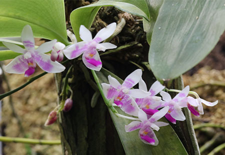 Dendrobium thyrsiflorum sp 1昨年、マレーシアのPutrajaya Floria Festivalで現地ラン園のブース内にDen. thysiflorum spのラベルが付いた、現地価格としてはかなり高価な株を見つけ、spとあるが一般種と何が違うのかと質問したところ、通常この種はセパル・ペタルが白色か、稀に全体が淡いピンク色であるが、この株は、セパル・ペタルの先端部が青味のあるピンク色をした希少なフォームであるとのことでした。Den. thyrsiflorumは中国、インド、ミャンマー、タイ、ベトナムの標高1,200m - 2,000mに生息する中温タイプのデンドロビウムです。多輪花で豪華な印象から市場性が高く、現在セパル・ペタルが白色の一般フォームであれば3-4本の疑似バルブサイズが1,500円程と安価です。一方、似た花でセパルペタル全体がピンクのフォームはネット上での多くがハイブリッドで、原種と思われる種は1-2画像しかなく市場情報もほとんどありません。 そうした背景からspに興味が湧き、20茎からなる大株のspを持ち帰りました。当初、本種は高温環境でも開花するとの情報もあり胡蝶蘭温室で同居させていたのですが1年経っても開花する様子が無く、昨年10月に中温室に移動しました。今月に入りこの株が開花しました。下写真です。海外からの移植後初の開花のためか、色が薄いのですが確かにセパルペタルの先端部に青味のあるピンク色(写真右)が乗っています。先端部がベース色と異なるフォームをもつデンドロビウムは、本サイトでしばしば紹介しているDen. sp sumatraやDen. sanguinolentumに見られるように環境条件によって濃度がしばしば変化します。環境に順化すればこのバイオレット色が濃くなるのではと次の開花に期待しています。