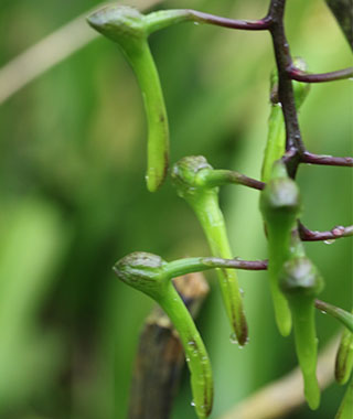 Dendrobium hymenophyllum Den. hymenophyllumはインドネシアJavaおよびスマトラ島生息種で、セパル・ペタルが緑と赤色の2つのフォームが知られています。緑フォームにはさらに茶褐色の小斑点が入るタイプと斑点が全く入らないflavaタイプがある一方、赤フォームはダークマゼンタからレッドブラウン(あずき色)まで様々です。赤色フォームがより入手難です。昨年秋にDen. hymenophyllum redの注文を行いましたが、Den. jiewhoeiが誤ってロット単位で入荷してしまいました。なぜそれぞれがスマトラ島とボルネオ島の生息種、さらに前者は高温タイプ、後者は低-中温タイプであるのにミスラベルが起こるのか、希少性や現地取引価格から言えば2008年登録の新種でボルネオ島生息のDen. jiewhoeiの方がかなり高価であることから故意ではなく、おそらく株がよく似ているため2次業者のストックヤードでの取り扱いミスであろうと思われます。Den. hymenophyllumの色フォームを株から判断する一つの手段として葉裏の色があります。この色と花色がよく一致するためですが前記したように、それは株がDen. hymenophyllumであることが前提で、蕾の無い葉と茎だけの株では、特にCalifera節と前記したようなミスが発生します。また蕾があればその色合でセパル・ペタルの色だけでなく斑点の濃度まで予測できます。下写真は現在開花中の株を撮影したもので上段は花、下段はその蕾です。左は一般的なグリーンに茶褐色の斑点が入るタイプ、中央は斑点の無いFlavaタイプです。蕾のドーサルセパル相当位置やSpur(後方に伸びた突起部)の色合いに違いがでます。 さて問題は右写真下段の蕾です。Den. hymenophyllum greenのロットの中から出ました。蕾のセパル・ペタルに当たる位置の色は赤色というよりはむしろ黒色に近く、しかしSpurは緑色です。蕾が赤褐色は一般的には赤フォームとなるのですが殆んどの場合、Spurも赤味が全体あるいは一部に現れます。もし開花まで写真の色合いが変わらないとすると、これまでの経験からはセパル・ペタルがほぼ黒に近い緑色の花が開花することになります。このようなフォームはネット上には見られません。果たして稀なフォームなのか、数日後の開花までに色褪せて、レッドブラウン色のいわゆる一般フォームに落ち着くか、しかし赤色フォームにしてはSpurの緑が鮮明過ぎます。