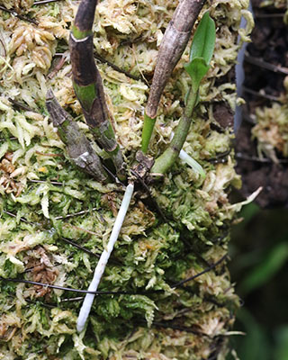 Dendrobium igneo-niveum Sumatra島生息の本種は人気が高く、現在インドネシアに大株(15茎以上のクラスター株)を注文しているところです。茎4-5本の株で本サイトでは3,500円です。Formosae節としては栽培が比較的容易な種ですが、この節固有の、日本の季節の変化に対する管理(主に水やり)は技術が必要で栽培としては中級から上級レベルとなります。6年前の会津時代は素焼鉢にミズゴケ100%の何の変哲もない組み合わせと3年ごとの植え替えで良く成長していました。ところが浜松に来てからは他のFormosae節と同様に機嫌が悪く、開花した年の冬は越えられるものの新芽が現れず高芽が出た後は、じり貧状態の株が増えました。限られた温室空間に数千株ある環境では種毎の最適な管理をすることはできないことが最も大きな原因で水やりの加減が必要でした。 そこで2年ほど前から、皆同じような管理の下、良好な結果を出すにはどのような取付材や植え込み材が良いかを見つけ出そうと本種に限らずFormosae節のほとんどを素焼き鉢、ヤシガラマットにミズゴケを巻いた円筒、木製バスケット、炭化コルクなどにそれぞれ3-5株づつ植え付け栽培結果を観察することにしました。 Formosae節のほとんどは炭化コルク(あるいはヘゴ板)が良いとの結論を得ましたが、Den. igneo-niveumに関しては、今年春の結論としてミズゴケとクリプトモスをそれぞれ50%配合の植え込み材で木製バスケットが良く、意外であったのはヤシガラマット円筒は悪い結果となりました。自然界では他のほとんどのFormosae種と同様に、本種も大小さまざまな木に活着しており、バルブは上方に伸長し、茎も多くは立ち性であり、鉢やバスケットには植えにくいものの乾湿のメリハリの少ない適度に湿気のあるバスケットの方が良いようです。この方法であれば3年目の春にバスケットの植え込み材を交換すれば、水やりに特に気を遣うことなく、高芽の発生を抑えると共にバルブ元から年に2本程度の新芽を発生させ、3-4年かけて大株にできるのではと思われます。これを受けて木製バスケットはコストアップになるものの全ての株を植え替え、さらに成長具合を調べることにしました。 下写真上段左は現在(14日)開花中のDen. igneo-niveumで、Formosae節によく見られるようにバルブの太さが花の大きさに関係するようで上段右写真の左が太いバルブの花で、右が一般サイズです。下段は木製バスケットにミズゴケとクリプトモスで植え付けた株の今年発生の2本の新芽2例です。