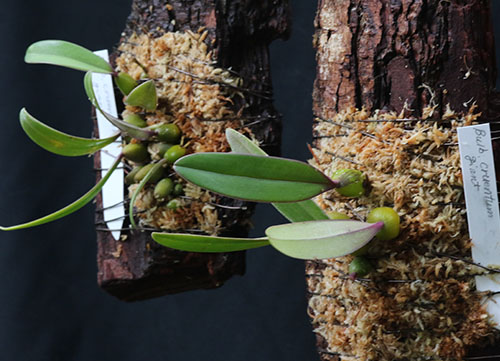 Phalaenopsis minus 今回のPhal. minusは生息地タイからの直輸入となりました。近年ではPhal. finleyiとも呼ばれます。浜松到着がサンシャインラン展の2日前であったため植え付けが間に合わず、プラスチックポットにミズゴケの仮植えの状態のまま数株の販売を行いました。その特異な花形状のためか人気があり完売でした。本種は他のAphylllae亜属同様に根が植込み材に覆われるポット植えは適しません。長い扁平した根の裏側を取付け材側に、一方、表面(緑色した側)はむき出したまま取付ける植え替えが必要です。本種の栽培の難しいところは、こうした植え付けのため、根が外気に直接晒られた状態となり乾燥し易く、乾湿の変化が大きくなることで株がじり貧状態になり易いことと、落葉性のためかん水、温度、輝度のコントロールとタイミングを季節に応じて調整しなければならないことです。今回の入荷株は葉が大きく良質で、ラン展後に直ちに支持材に植え付け(下写真)ました。上記対策として、ニュージーランド産のTree-Fernと言われるシダの根100%からなる支持材を用いました。この素材はヘゴ板以上の、これまでの支持材としては最も高い保水力をもちます。50㎝長x7㎝幅(15㎝幅を裁断)のサイズに20㎝ほど薄くミズゴケを敷き、株を取り付けました。 Bulbopyllum orientale Bulb. orientaleは中国雲南、タイ、ベトナム生息種で同じ節のBulb. careyanumやBulb. lilacinumと共に、その稲穂のような花序でよく知られたバルボフィラムです。本サイトではBSサイズ4-5バルブで2,000円で販売しています。花色は薄黄色から赤味のあるオレンジ色まで個体差があります。今回、葉が濃緑色で葉裏が赤紫色の株が多数含まれており、これを入手しました。バルブが赤褐色は本種でしばしば見られる色(写真右)ですが、赤味のある葉裏を持つ株の栽培がこれまでに無く、葉裏の色は花色に関係することがあり、果たしてどのような花が咲くのか。一般種として本種はあまり注目されないこともあり、それならばと今回は5㎝角で50㎝長のTree-Fernに合計35バルブ程を3面に寄せ植え(写真左)しました。一斉に開花すれば華麗な風景になるのではと期待しています。これも展示会出品用としての売り物です。