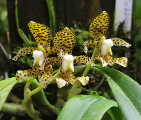 Bulbophyllum incisilabrumとBulbophyllum claptonense Bulb. incisilabrumとBulb. claptonenseが中温温室にて開花中です。前者はスラウエシ島、後者はボルネオ島のそれぞれ標高1000m前後に生息のため、日本の盛夏の暑さは嫌うようで、夏季は軒下等の風通しの良い場所に置くことが必要です。複数の花が同時に開花すると良く目立ちます。Bulb. claptonenseはBulb. lobbiiと花形状が似ていますが、リップ中央弁の中央部に腺状突起(膨らみ)があり目視で確認出来ます。両者とも夜間はドーサルセパルが下がり、ペタルが前方に曲がり花を閉じます。高地雲霧林の生息種の特徴で夜露を凌ぐためと言われ、温室に移っても遺伝子に引継がれたその行為は変わりません。
