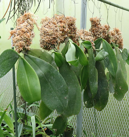 そうした経験を通して、Spaturala節のほとんどの種でこれまで行ってきたポット植えにその原因の一つがあるのではないかと思うようになりました。本ページでしばしば取り上げているように、自然での着生の姿勢や根周りの環境を知ることがまず必要で、それには剥がされた根の状態(平面的にビッシリと隙間なく平行に並んでいるか、それぞれの根がランダムに四方八方に伸びているかなど)や、根の伸長方向と茎の伸長方向との関係、さらに新芽の発生(成長)点を見れば凡そは判断ができます。結果として本種はほぼ垂直な支持木に活着していたことが分かります。また新芽が発生する成長点はバルブの1節上部にあることで常に上方に向かって株が増殖することが分かります。このためホットに茎を立てて植付けようとすれば古い茎元の1-2節は植え込み材の中に埋め込まれる結果となります。これでは古い茎はやがて枯れ、株は比較的若い茎のみとなります。よって茎数も少なくなります。そこで垂直取付材とするのですがコルクやヘゴ板に、花茎を含め1.5m - 2mにもなる本種を取付けた株全体の姿や見栄えも考える必要があり容易ではありません。