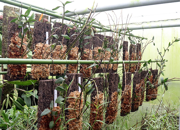 マレーシアから持ち帰った60株のDen.. rindjanienseの植え付けがようやく完了しました。今回入荷した株は多くが40㎝以上の疑似バルブ(茎)をもつ大株です。約半数をバーク木片と炭化コルクに、他はスリット入りプラスチックポットおよびバスケットのそれぞれ4つの植付け方法としました。この植付けの違いは入荷時の根の形態に合わせたためです。大株を60株並べた姿は壮観で下写真の上段および下段左となります。下段中央は一部の拡大写真で、30cm - 40㎝を超える茎を示しています。一方、上段右は50㎝を超える長さの茎をもつ特大株でバーク木片3Lサイズ(縦40㎝)に取り付けた展示用仕立てです。下段右の花画像は昨年撮影した本種の花見本です。本サイトでは株サイズにより3,500円からとしています。