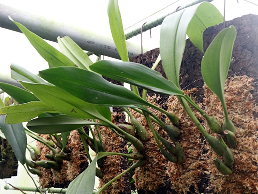 昨年11月に紹介した本種はミンダナオ島Bukidnon生息株でしたが、今年7月には隣の州であるLanaoからも入手ました。この株が現在中温室にて開花中です。下写真がそれらで下垂する1m程の長さの疑似バルブのnode(節)からそれぞれ花柄がでて1輪つづ、バルブ当たり5-7輪の3.5-4㎝の花が開花します。
