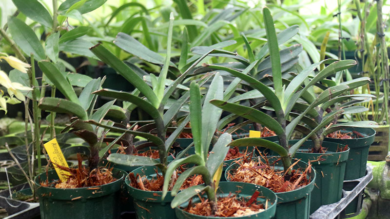 また写真下段左の素焼き鉢の前方から後方に向かう左3列もDen. lydiaeで、右2列がCleisocentron gokusingiiです。Clctn. gokusingiiはブルーの花色で知られており、ボルネオ島Sabah州標高1,800m生息のクールタイプとなります。本サイトでは中温室にて栽培をしており、夜間平均温度はDen. lydiae同様に20℃以下としますが日中の温度は30℃を越えても問題は見られません。むしろ昼夜の温度差が小さいと開花が難しいように思います。写真下段右のClctn. gokusingiiの花は21日の撮影で仮植え中に開花していました。Den. lydiaeとClctn. gokusingiiは両者のよく似た栽培適正温度のため同じ場所に並べています。