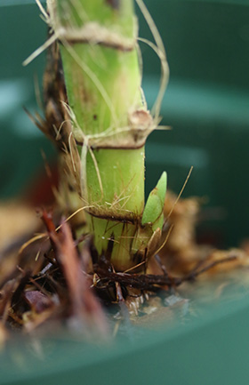 8月にマレーシアから高温障害で傷んだ本種を持ち帰ったことを取り上げましたが、最優先で植え付けを行ってから丁度1か月が経過します。その後の状態を調べてみたところ、多数の株で新芽が発生していました。昼夜の最高・最低温度がそれぞれ22℃と16℃のクール温室においての順化栽培です。適温であれば、相当傷ついていても生きた葉と根が僅かでも残っていれば、再生する生命力を見ているようです。この小さな芽から葉が開くまでの期間が最も病気に罹り易く、この期間の病害虫防除処理は不可欠です。一方、Cym. elongatumは2週間遅れの植え付けで、現在頂芽の伸長を待っているところです。