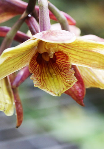 ソロモン諸島からの名称不詳のデンドロビウムで、ラン園では初入荷とのことでした。写真左および中央が株で、炭化コルクと木製バスケットの植え込みです。根の形態からは垂直面での活着が窺えます。葉は卵形から楕円形で表面は濃緑色、裏が紫色(左写真)と、表面と同じ緑の株がそれぞれ混在します。ステムは固く立ち性で、長さは左写真は40㎝程ですが大きな株では中央写真に見られるように1.5m程となります。花は右写真で葉元から2本の花柄が伸び2輪1組で開花するようです。開花時点では緑味(上段)が強く、日が経つにつれ黄色に変化します。株様態からは高温タイプと思われます。![]() |