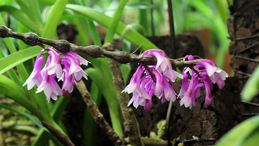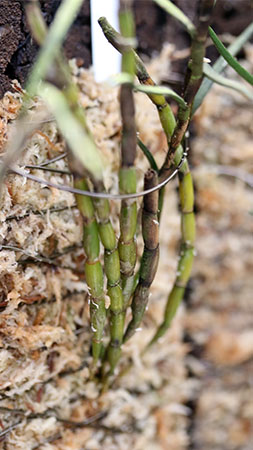 本種はボルネオ島Sabah標高800m - 1,000mに生息し、30cm - 40cmの長く下垂する花茎に上部の3 -4輪の花は黄色のベース色にまだらに赤い斑点のあるフォームと、下部には8 - 10輪の白色をペースに赤紫の斑点でほぼ埋め尽くされた2つのフォームを持つDimorphorchisです。Dmrphr. lowiiやrosiiは良く知られていますが本種は2008年登録の新しい種となります。2017年7月のマレーシア訪問にて最初に入手して以来2回目となります。Dimorphorchisを現地で入手する際の問題点は、野生栽培株は殆んどの株が曲がりくねっており、茎が真っ直ぐ伸びた株はほとんど無いため植え付けを考えると非常に厄介なことです。10株程を入手予定でしたが今回は姿勢の良い株のみを3株選び持ち帰りました。下写真がそれらで、このようにストレートに伸びた株は5本に1本程度しかありません。2株はスリット入りポットに大粒のバークとゼオライトでの植え込み(写真左)、1株は木製バスケット(写真右)としました。いずれもBSサイズであり来年の開花を期待しています。サンシャインラン展にはポット植えの2株を出品します。国内マーケットのネット情報は見当たりません。| Dmrphr. tenomensis | |