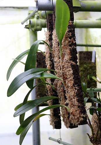 パプアニューギニアからのバルボフィラムです。orchidspecies.comによれば花は5㎝以上と大きく、これがリゾームの複数の節から花柄が延び同時開花するようでネット画像からは華やかさが感じられます。新しい種ではないのですがなぜか国内のマーケット情報が余りありません。下画像は20株入荷した内の3株で本日(20日)の撮影です。炭化コルクは50㎝長であり、一株の葉数が3-4枚であることから分かるようにリゾーム間隔は長く、伸びしろをかなり長く取っての植え付けとしました。こちらもラン展に出品予定です。| Bulb. tollenoniferum |