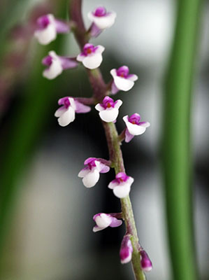 下段左はボルネオ島生息のDen. dianae f. flavaです。本種も赤と黄色のツートーンカラーからリップ側弁基部に褐色の斑点が入るフォームと多様ですが、写真は黄緑色一色のflavaフォームです。中央はBulb. hamatipes.で当サイトでは初めての開花です。 右は中国南部雲霧林帯生息のSchoenorchis gemmataです。5mmに満たない花で温室の奥に置けば開花に気付かない程です。前者のバルボフィラムとともに低温室にての栽培です。