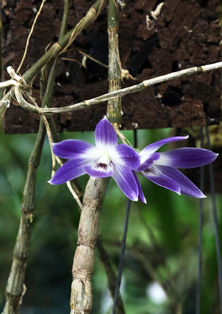 6月末の浜松温室では開花種はそれほど多くなく、特に胡蝶蘭原種のこの時期は僅かです。それでも下写真は現在開花中の一部となります。この中で本サイトでの初花はボルネオ島の高地に生息するCoel. hirtellaです。またDen. enderitiiに似た花をもつスラウェシ島からのDen. spは、5月に入荷してから1度開花があり花柄当たり揃って2輪でしたが、環境に順化したせいか下垂する総状花序に5輪が開花しています。Den. endertiiはボルネオ島固有種であることからendertii-complex(仲間)としました。Phal. bellinaは野生株としては品のある色合いと思います。Den. papilioは毎年この時期に開花します。