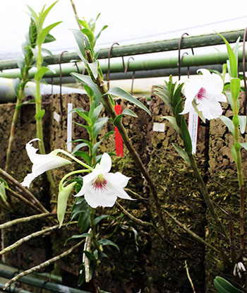昨年9月末頃から開花が始まり現在までの5ヵ月間近くDen. igneoniveumが咲き続けています。一向に開花期が終わる様子は無く、蕾を付けた茎が今だ多数の株で見られます。下写真はいずれも本日(2日)撮影したもので、1本の花軸に8輪が同時開花している株が2株あり、左写真はその一つです。花軸当たり8輪がこれまでで最も多い輪花数で、平均値は6輪です。ミズゴケを厚く敷いた炭化コルク付けで、濃緑色の葉色から当初低輝度が良いのではと思いましたが、現在は温室内の比較的輝度の高い場所での栽培です。