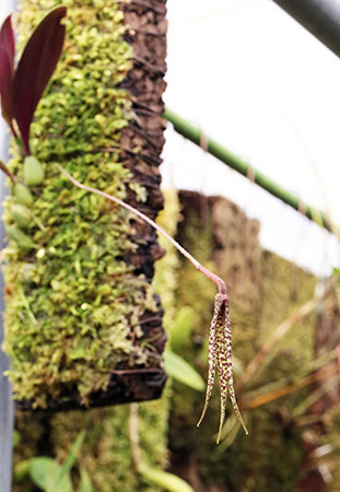 フィリピン・ミンダナオ島Bukidnonで収集され、2016年OrchideenJournalに発表されたバルボフィラムBulb. inacootesiaeで現在10株程に開花が始まりました。 当サイトでは先月の歳月記に記載したBulb. rugosum同様に中温室の中でも高温に近い場所で栽培をしています。本種は高輝度を好むようです。根は常に湿っていることが必要で、当サイトでは厚めにミズゴケを敷いた炭化コルクへの植え付けです。1年近い栽培で写真右に見られるのように良く成長しています。乾燥気味な環境ではミズゴケの量を増やすか、へゴ板やバスケット植えが良いと思います。花を見れば大半の人が入手したくなるバルボフィラムの一つですが、マニラ近郊のラン園によるとDen. deleoniiなどを含めミンダナオ島Bukidnon生息種の入荷は昨年来、途絶えているとのことです。