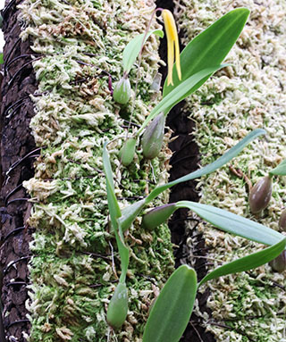 次に2017年に、Bulb. elassoglossumの発注でsp2が入荷しました。これもBulb. elassoglossumとは異なるミスラベルでした。ここでそれぞれの花とバルブ形状を比較するとBulb. williamsiiとsp1とはドーサル・ラテラルセパルの長さが後者は1/2で、バルブ間のリゾームの長さもほぼ1/2です。一方、Bulb. williamsiiやsp1とsp2とを比較するとペタルの形状がsp2は細長く、リップ前端が黄色であることと、バルブ形状もリゾーム長も異なり別種であろうと思われます。Bulb. wiiliamsiiのラテラルセパルは4㎝、sp1およびsp2は2㎝です。