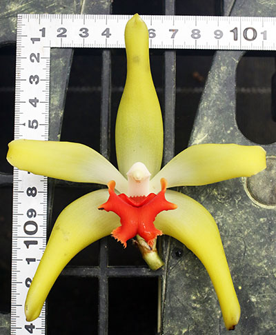 温室のレイアウト変更は最後のバルボフィラム1棟分がほぼ半分まで進み、来週早々には終了予定です。浜松では32℃の気温の中、’すごく涼しくなりましたね’が挨拶となりました。お互いつい笑ってしまいます。32℃を下回れば出荷準備の再開となります。連日の猛暑を乗り越え開花している花の一部を撮影しました。全て28日午前中の撮影です。写真の並びは撮影した順です。Den. uniflorumはリップにある3本のラインが薄緑色のためalbaフォームとしました。よくDen. ovipostriferumと間違ってネットに掲載されているDen. deareiは数年ぶりの写真です。開花寿命が凡そ2ヶ月と高温系デンドロビウムの中で最も長い多輪花種の一つです。写真のBulb. fascinatorはsemi-albaともされますが、セパルやリップの色は明瞭な固有色であることからgreenフォームとしました。エクアドル生息のIda cinnabarinaは手のひらほどの大きな花です。| Den. punbatuense Borneo Sabah | Vanda lamellata v. remediosae Phiiippines | Den. uniflorum f. alba Borneo |