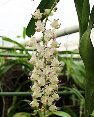 浜松ではこれまでに経験のない、1週間以上毎日雨天が続くと、次には1週間以上全く雨のない猛暑に襲われ、とうとう16日には観測史上初の40℃を超えてしまいました。今年の国内最高気温とのことです。エアコンを稼働していない温室内は当然それ以上の高温となります。当サイトの温室では、かん水に地表から120mの地下(井戸)水を用いており、水温は通年で一定の16℃です。16日にはこれを午前9時と午後1時に散水し、温室内を34-38℃に維持しました。これまで40℃超えは、5-8月にフィリピンやマレーシアを訪問した際、マニラやクアラルンプール国際空港のビルを出たときの気温とほぼ同じで毎年体験してきましたが、まさか浜松でもとは驚きです。問題は、こうした高温下では出荷が難しくなることです。受入れ側に冷暖房エアコン温室があれば良いのですが、出荷では植込み材を新たなものに替えたり、根や葉の剪定で病害防除処理を伴うことがあり、厳しい環境変化は種によるものの、1か月間程は好ましくなく、これまでも気温が32℃以上となる間は出荷は控えていました。気象予想では猛暑はまだ暫く続くようです。| Inflorescences of Aerides magnifica & magnifica f. alba Photos:Aug./17 | |||