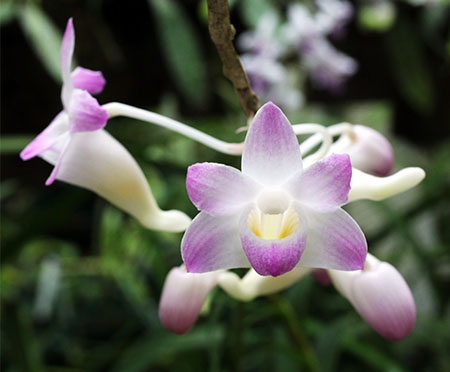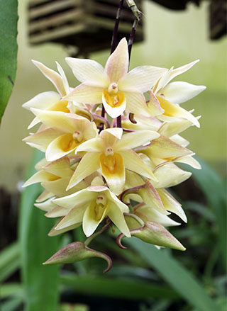 久々の登場デンドロビウム2種 現在(17日)、Den. fairchildaeとDen. microglaphysが開花中です。前者は10年以上前にフィリピンで入手した当サイト最初のデンドロビウムで、ルソン島標高1,200m生息の中温タイプ、後者はボルネオ島標高800mに生息の高温タイプです。いずれも下写真にみられるように多輪花種です。