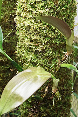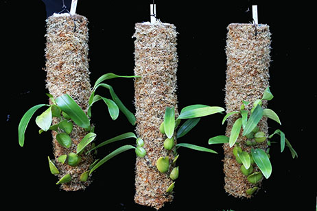 最終仕上げは円筒の内部の詰め込み材の選択です。候補としては相性の良いミズゴケ、クリプトモス、バーク、などが考えられます。しかし4の段階で、すでにミズゴケの使用量は50㎝長の筒の場合、4号素焼き鉢の使用量の凡そ3-4倍となります。円筒形内部までミズゴケを詰めるとなると可なりの材料費を覚悟しなくてなりません。さらにクリプトモスも同様ですが、詰め込む量や強さによっては、芯にまでかん水の際の水が浸透せず、筒表面のミズゴケだけに浸み込むこともあります。当サイトでは下写真左のような厚手(写真は3mm厚)の親水和性のある不織布を中央写真のように丸めて筒内に納めます。結果、写真右のようになります。これで表面のミズゴケに、内面から長時間適度な湿り気を与えることができ、炭化コルクでは困難な、夏期の野外での栽培にも有効となります。寒冷紗のような水の通りが良さそうなメッシュ布を詰め込んでも良いと思います。この後は株の取り付けとなります。 ここで材料の問題として、ヤシ繊維マットが容易に入手できるかどうかがあります。現在、この3mm厚の不織布を3重重ねとし1㎝弱の厚みにしたものを代用できないか試験をしています。この試験とは、果たしてランに有害な防虫・防カビなどの薬品処理がないか、根を直付けして株が新芽の発生や根の活着、また開花など、嫌がることがないか等々を調べることです。胡蝶蘭Phal. bellina野生株のテストでは、この半年での栽培で問題なしとなりました。さらにデンドロビウムからVandaまで他属も現在試験中です。布の白色が気になるという趣味家がいるかも知れませんが、上写真のようにミズゴケをその上に一面覆うことで景色上の問題はありません。 下写真は筒型取付材に植付けたDen. toppiorum(左:5日前植付け))、Bulb. uniflorum Cameron Highlands(2列目:7月植付け)、Bulb. virescense(3列目:7月植付け)、Bulb. pardalotum(左:3年前植付け)のそれぞれで、7月植付けのバルボフィラムは多くの新芽が今年の酷暑にめげず大きくなっています。また3年前植付けのBulb. pardalotumは植付け時は6本の30㎝長程の細長い株でしたが現在、60㎝長の筒全体に繁殖し、最も湿気の多い下部は雑草のシダです。上記トップの写真2の奥にあるミズゴケ付け前の直径の大きな筒は間もなく実装のBulb. binnendijkiii用です。胡蝶蘭も一部はこうした筒に取り付ける予定です。 上記した筒型取付け材では、ほとんどの種で根の多くは筒の表面を這うよりも、内部に潜行します。長い根をもつ胡蝶蘭では根張り空間が限られると、やがて空中に大半の根が飛び出し、湿度の低い空間に晒され根は常に乾き気味となり、その時点から株の伸長が止まります。しかし筒型構造では常に湿気のある、筒内部に多数の根を張ることから実質成長に有益な根張り空間を広げたことになり、大きな葉を持つ株を得るのに有効となります。